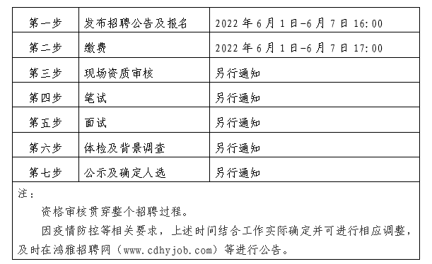 2022年6月1日至2022年6月7日16:00 在鴻雅招聘網(wǎng)(http://www.cdhyjob.com/)、鴻雅微信公眾號(hào)、國(guó)控集團(tuán)官方網(wǎng)站(http://www.lukchantech.com/)及上級(jí)部門(mén)要求的相關(guān)網(wǎng)站等發(fā)布招聘公告。