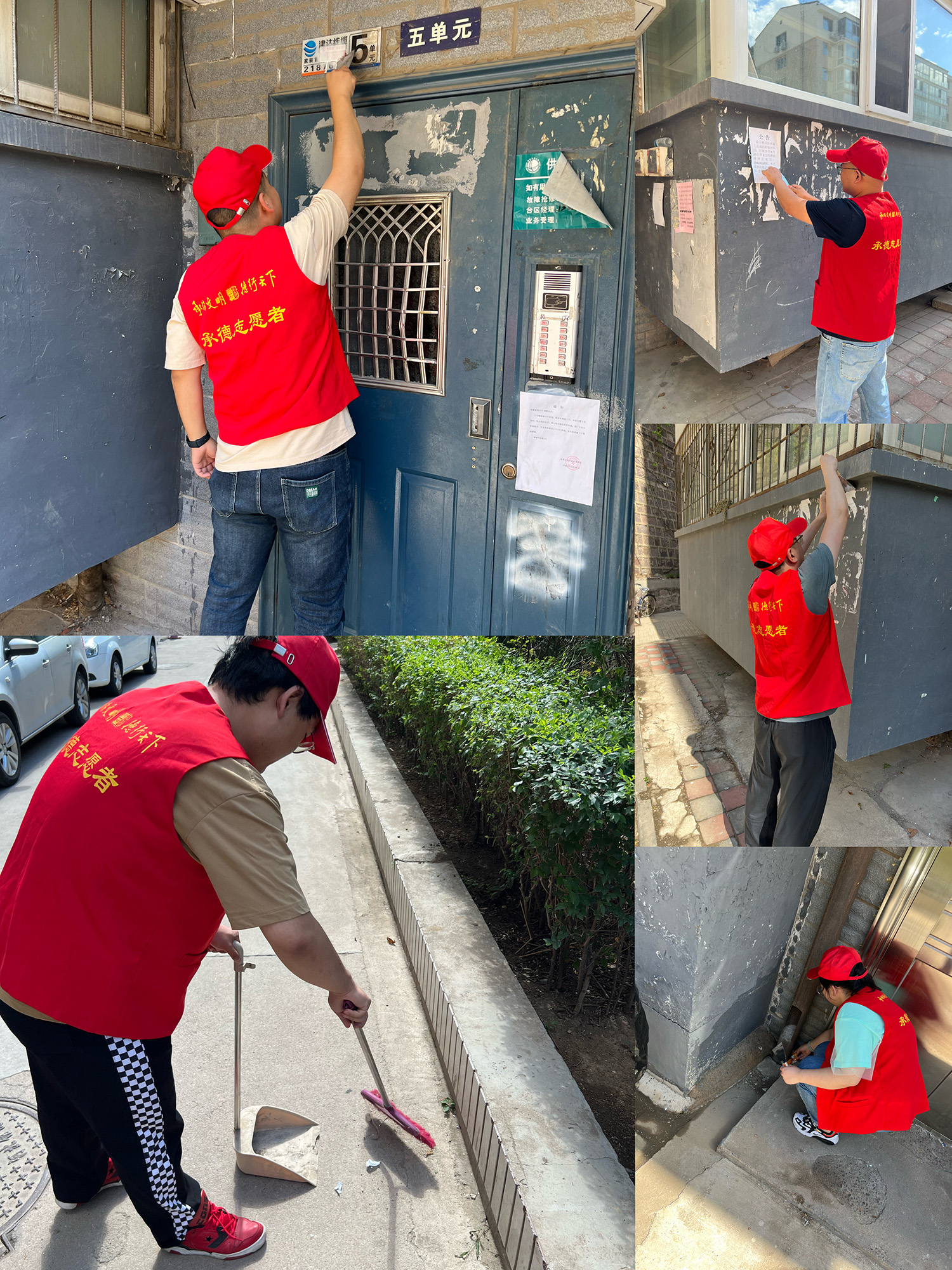 在活動(dòng)現(xiàn)場(chǎng),大家身穿紅色志愿者馬甲,手持鏟子、掃帚、簸箕等工具,在炎炎夏日中為小區(qū)居民打掃小區(qū)衛(wèi)生,著重清除非法小廣告以及衛(wèi)生死角、亂點(diǎn)。